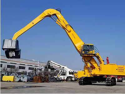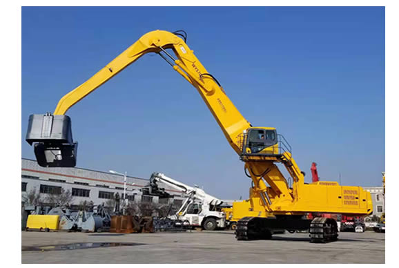 該設(shè)備分別采用了大功率“國(guó)三”標(biāo)準(zhǔn)發(fā)動(dòng)機(jī)、380V 西門子電機(jī),以及全套采用施耐德控制系統(tǒng)拖動(dòng)控制兩套力士樂(lè)液壓動(dòng)力機(jī)構(gòu)及先導(dǎo)液力控制的世界首臺(tái)“雙動(dòng)力”抓料機(jī)。該機(jī)設(shè)計(jì)了寬體結(jié)構(gòu)梁,以及加強(qiáng)型可更換正、負(fù)差的二節(jié)式作業(yè)主臂,最大吊重量達(dá) 25 噸、最大作業(yè)半徑為 18米。在 5 至 12 米作業(yè)半徑內(nèi),可配備 5.0 立方蚌殼抓斗,或 2.5 立方梅花廢鋼抓斗。