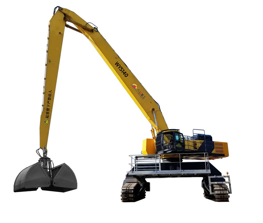 該設(shè)備分別采用原裝進(jìn)口康明斯發(fā)動(dòng)機(jī)、380V西門子電機(jī),以及全套采用施耐德控制系統(tǒng)拖動(dòng)控制兩套液壓動(dòng)力機(jī)構(gòu),該機(jī)設(shè)計(jì)了寬體結(jié)構(gòu)梁,以及加強(qiáng)型可更換正、負(fù)差的二節(jié)式作業(yè)主臂,最大吊重量達(dá) 25 噸、最大作業(yè)半徑為 24米。在5至12米作業(yè)半徑內(nèi),可配備 5.0 立方蚌殼抓斗,或2.5立方梅花廢鋼抓斗。